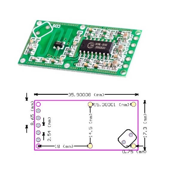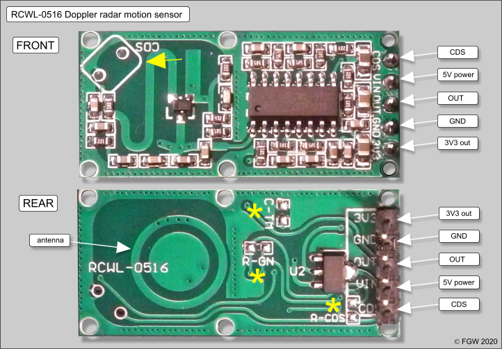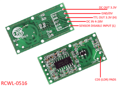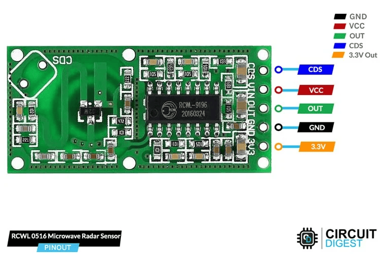 The RCWL-0516 features 5 pins for easy connection to microcontrollers and external circuitry: