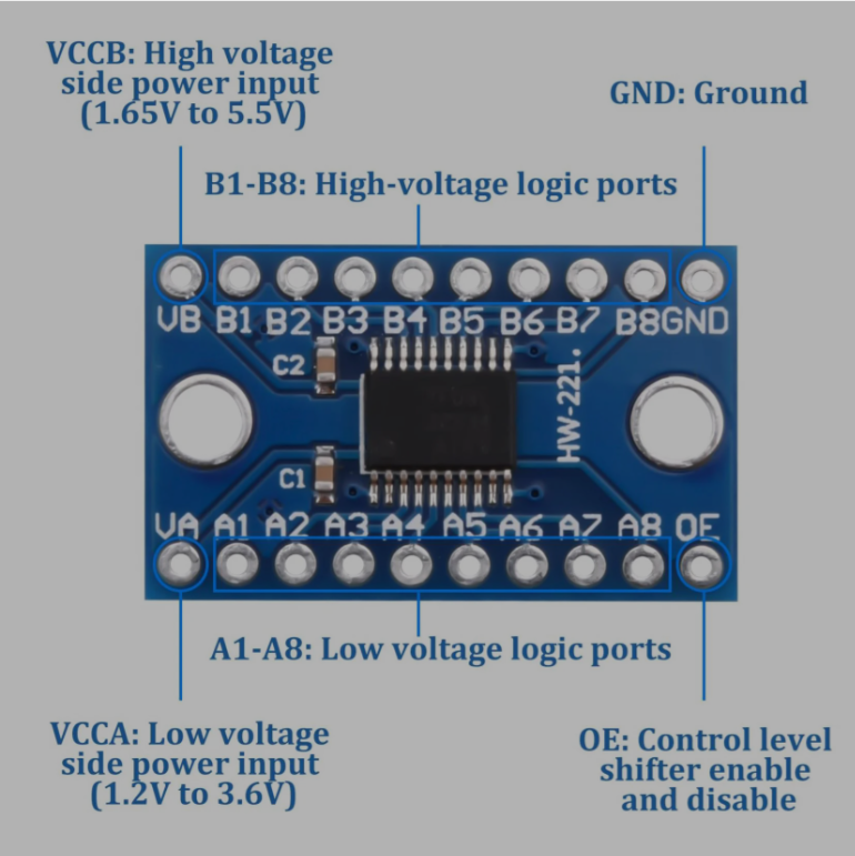 Pin NameDescriptionConnection NoteVALow Voltage Input (VCCA)Must be the lower voltage. Typically connected to $3.3\text{V}$.VBHigh Voltage Input (VCCB)Must be the higher voltage. Typically connected to $5\text{V}$.GNDGroundMust be common to both the low and high voltage systems.A1-A8Low Voltage I/O ChannelsConnect your $1.2\text{V}$ to $3.6\text{V}$ logic signals here.B1-B8High Voltage I/O ChannelsConnect your $1.65\text{V}$ to $5.5\text{V}$ logic signals here (A1 links to B1, etc.).OEOutput EnableActive HIGH. Connect to VA to enable always, or use a pull-down resistor to ground for MCU control.