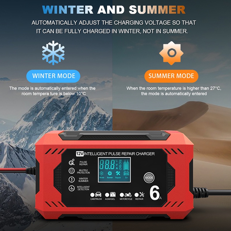 Seasonal Modes: Automatically detects the ambient temperature and adjusts the charging voltage (Winter/Summer modes) to ensure a full charge in the cold and prevent overcharging in the heat. ❄️☀️